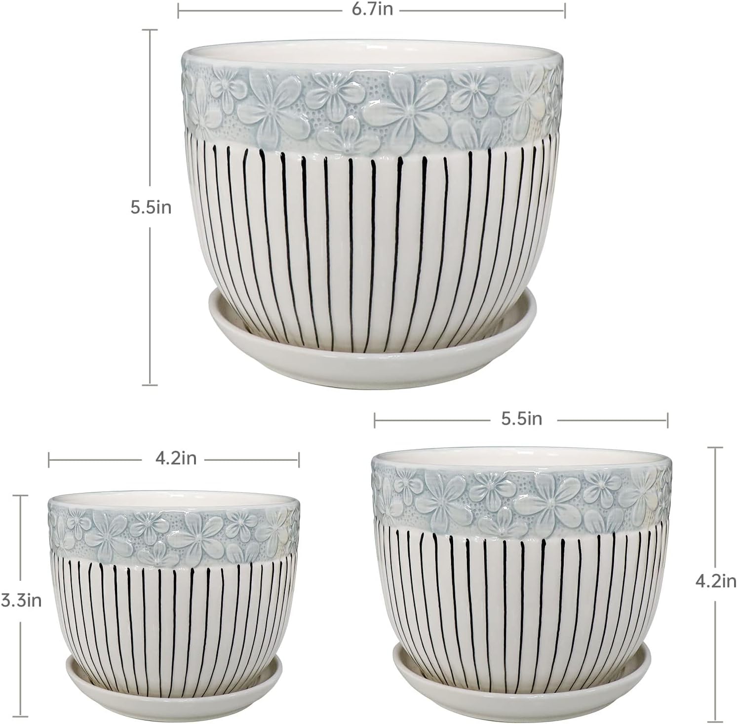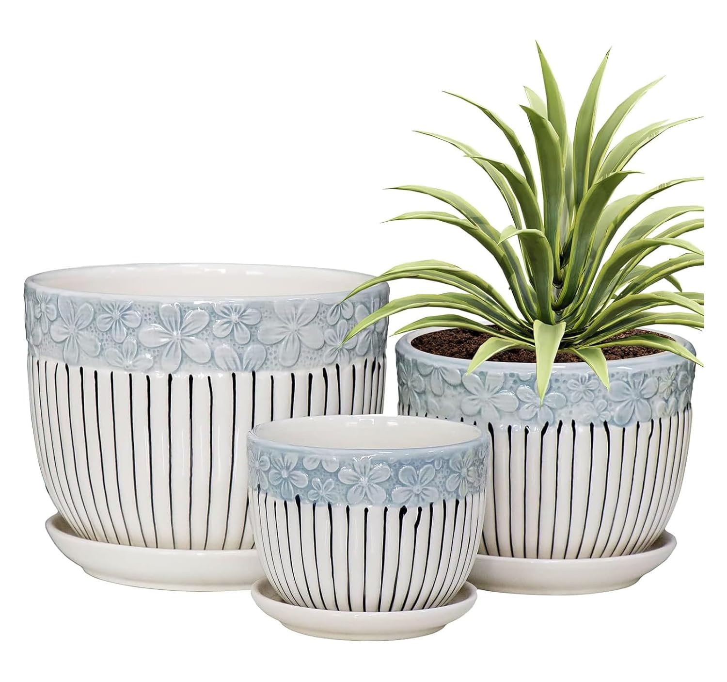 Set of 3 Ceramic Flower Pots with Saucer, Textured Planter for Indoor Plants, Cute Garden Pots Succulent Pots